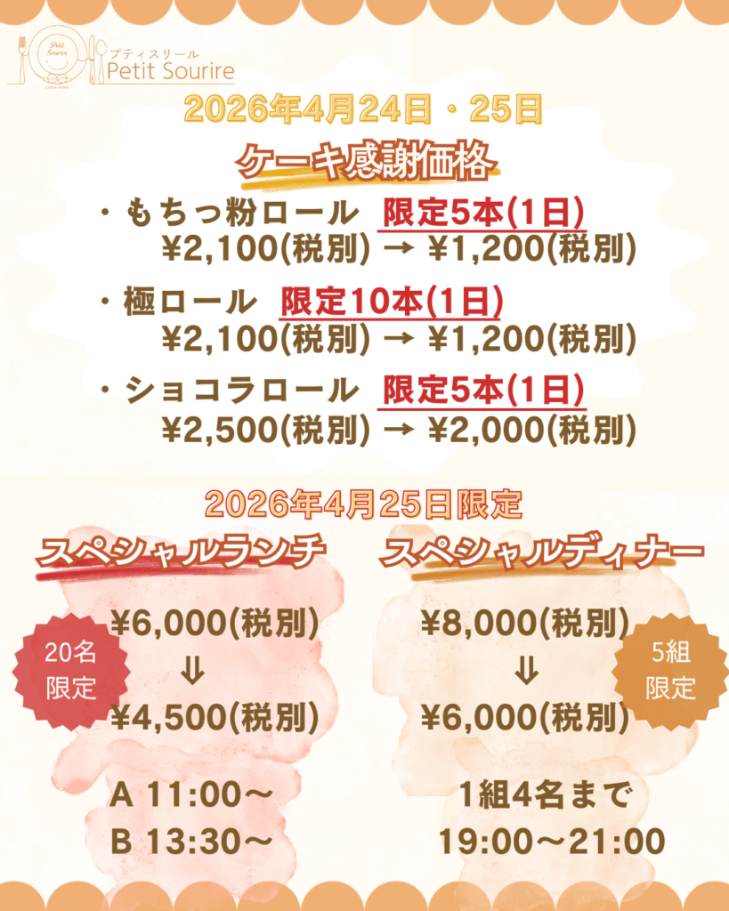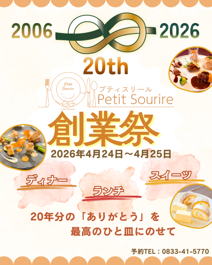 Petit Sourire(プティスリール)創業祭のお知らせ|下松市で20周年記念ランチ・ディナー・ケーキ感謝価格【2026年4月24日・25日】